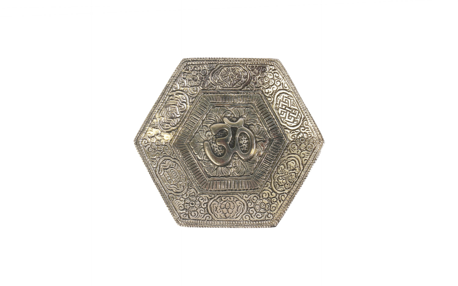 Elevate your ritual space with the Om Mandala Hexagonal Incense Holder. Cast in sturdy aluminum and finished in a radiant silver polish, this holder features a harmonious blend of geometry and spirituality. At its center lies the sacred Om symbol, surrounded by detailed mandala engravings—representing balance, unity, and inner peace. Designed to hold stick incense, the wide hexagonal base ensures stability while catching ash neatly. Ideal for those who seek mindful design with spiritual depth, whether for daily use or sacred ceremonies.